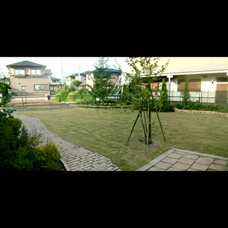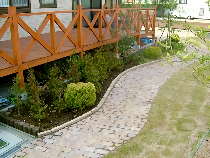 デザインレンガ舗装、レンガ花壇、植栽、芝張